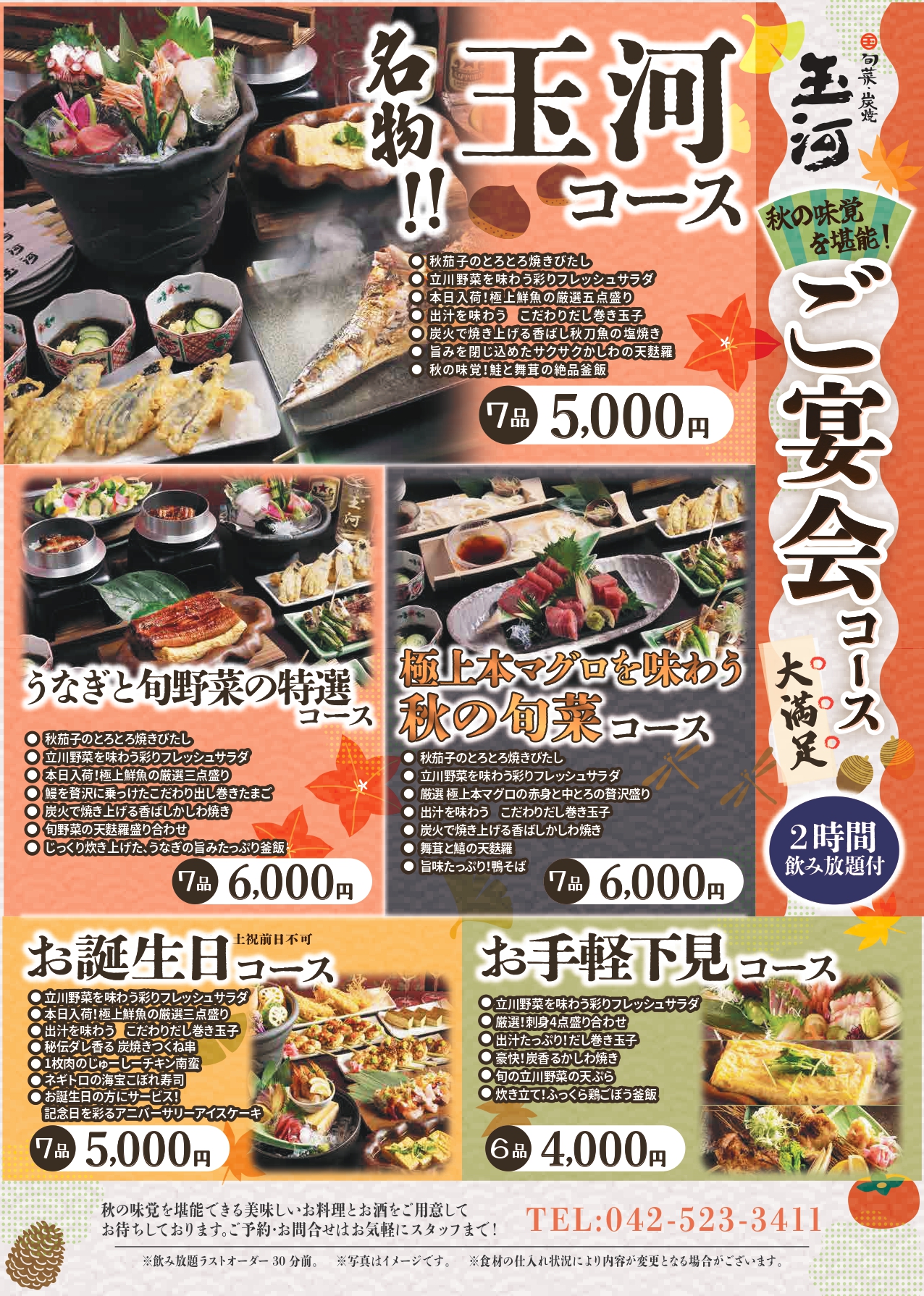 定番の『玉河コース』では、炭火で焼き上げる「秋刀魚の塩焼き」がラインナップ。香ばしく焼き上げられた秋の味覚は季節の移ろいを感じられます。 また、『昼飲みコース』がリニューアル。平日14時までの開始でお値段そのまま3時間たっぷり楽しめます!