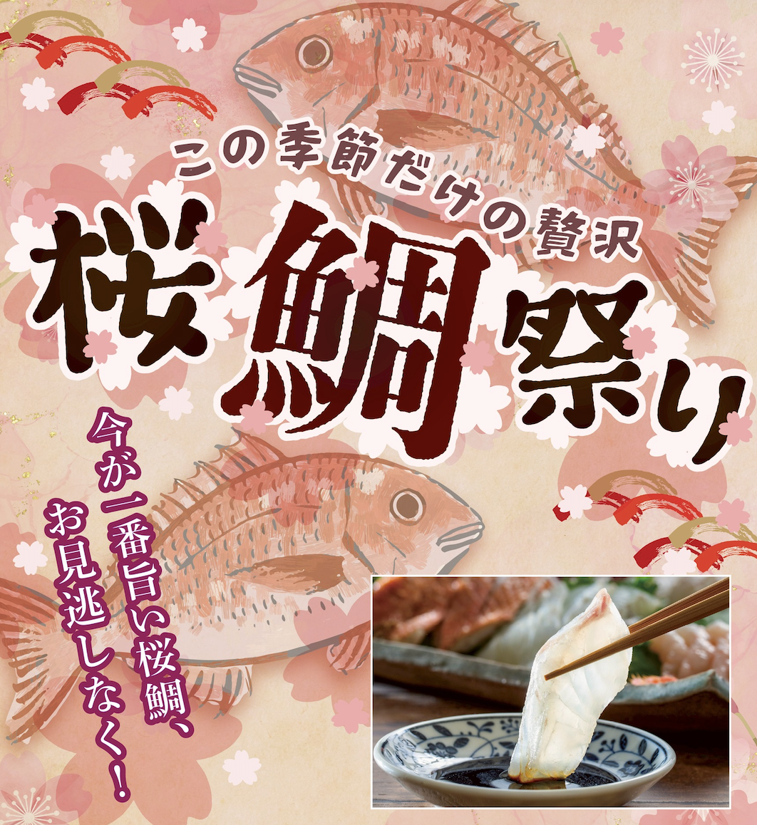 身がふっくらとし、上品な甘みが広がる春の旬魚・桜鯛を、各店ならではの料理でお届けします。ほんのり桜色に染まるこの時期だけの味わいを通して、春の訪れを感じていただける季節の宴です。